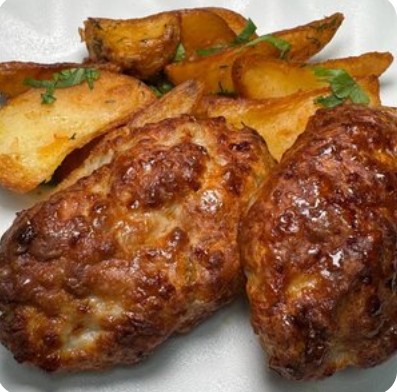 Куриная отбивная с грибами и рисом , Гуляш из говядины с макаронами, Цезарь 25см, Сырный соус