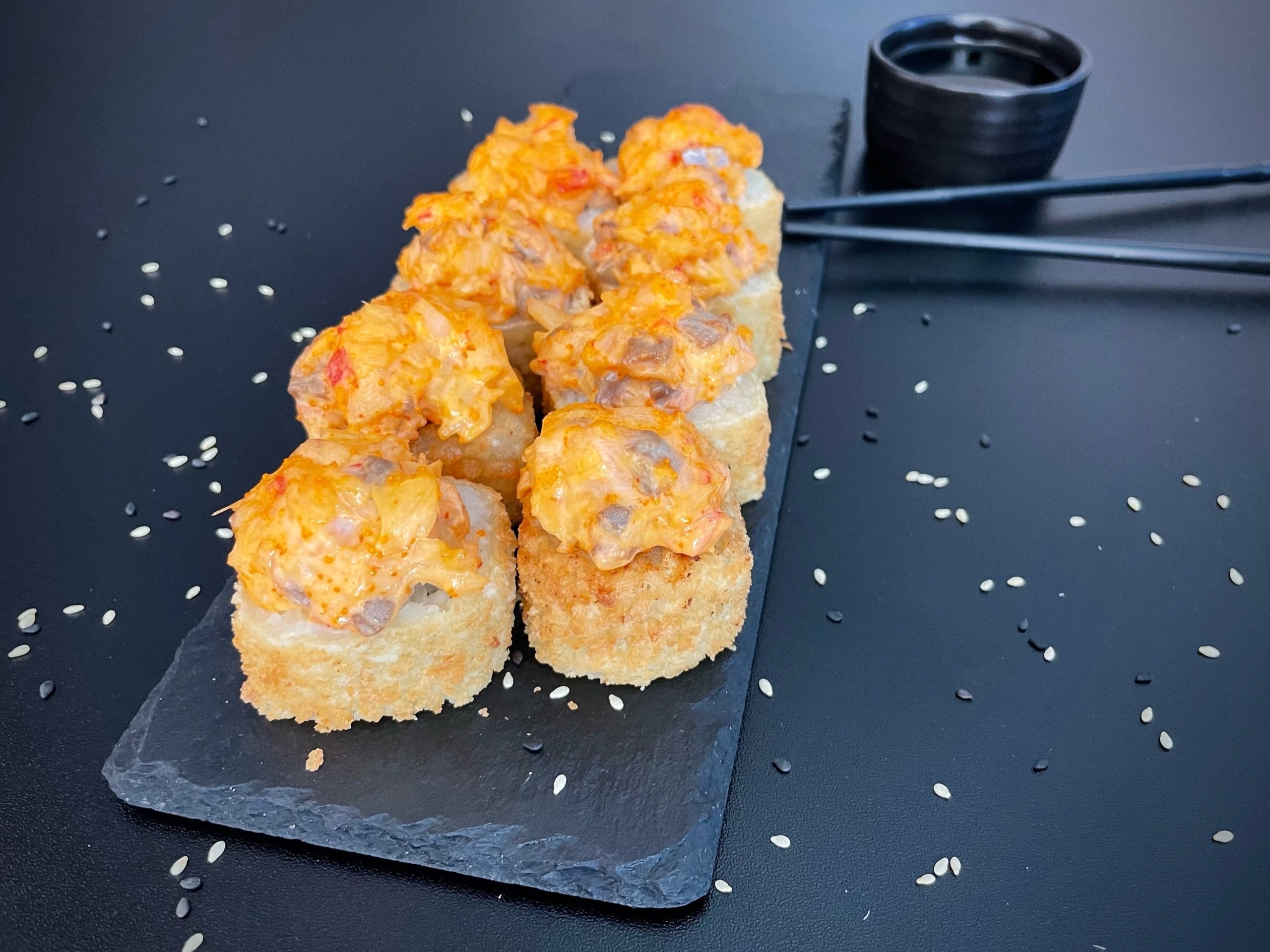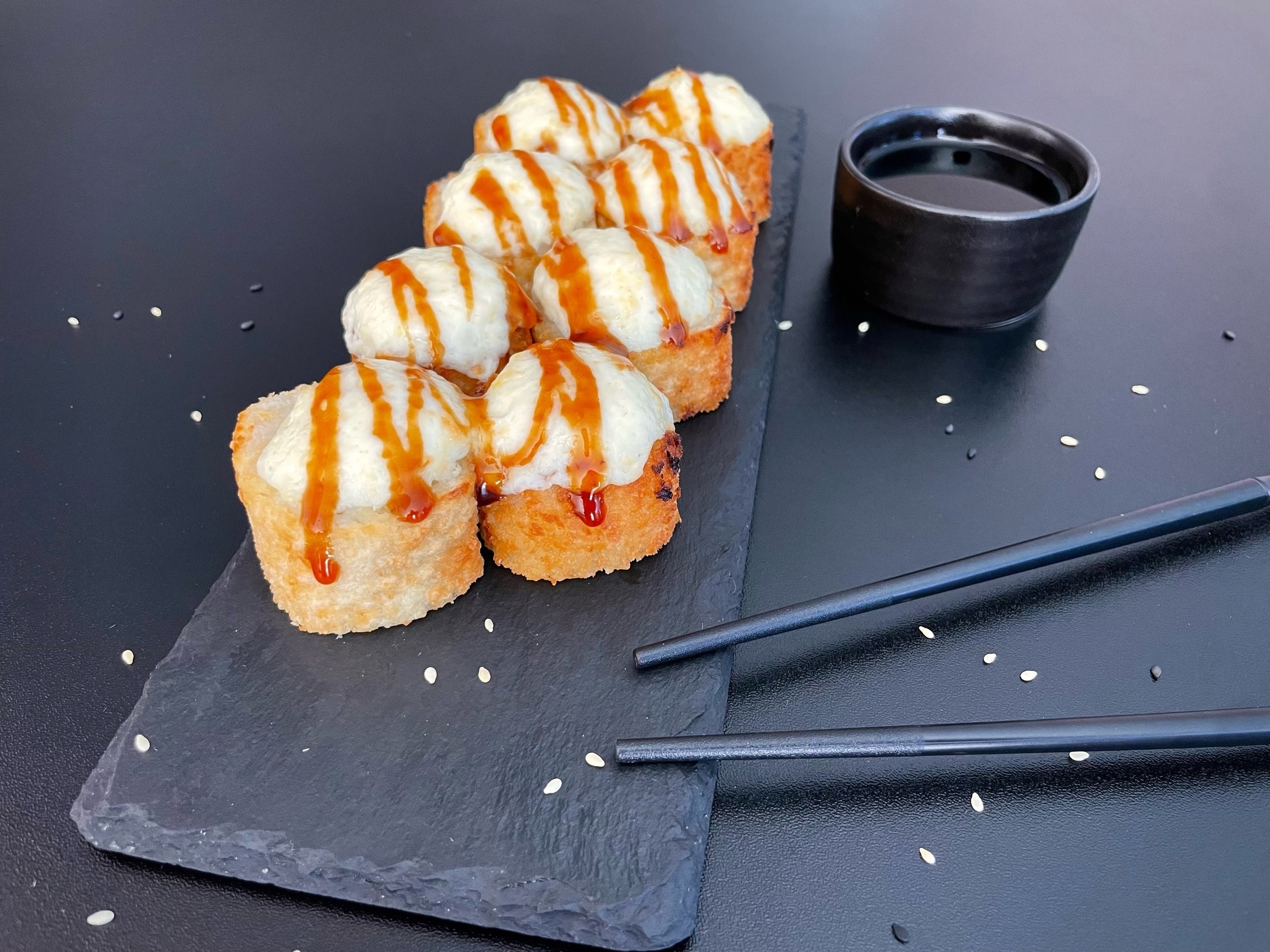 Сразу начали кушать, но было ощущение что роллы немного заветрились. Также кунжута очень много из-за чего очень жёсткие роллы.