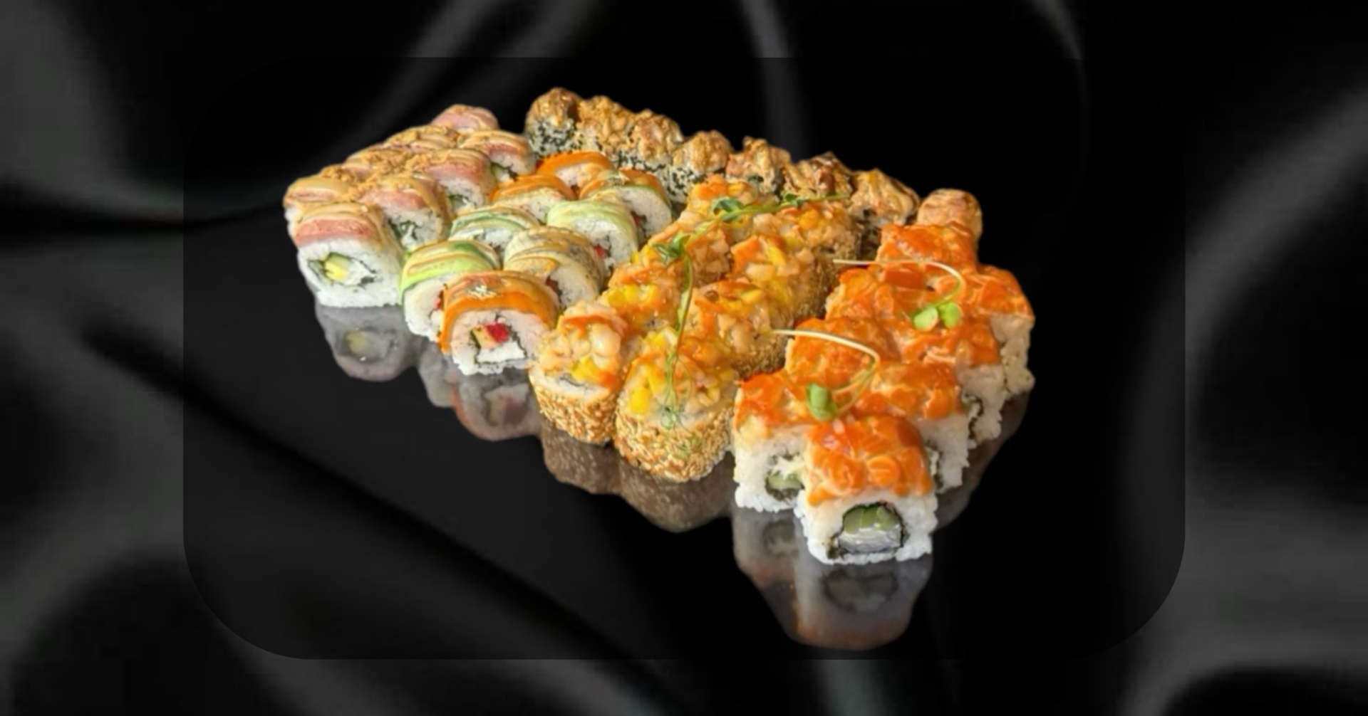 Запеченный с жаренным лососем, Запеченный с мидиями, Филадельфия классическая, Темпура ролл с крабом