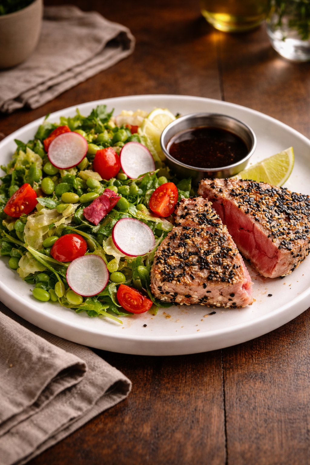 Стейк из тунца с салатом