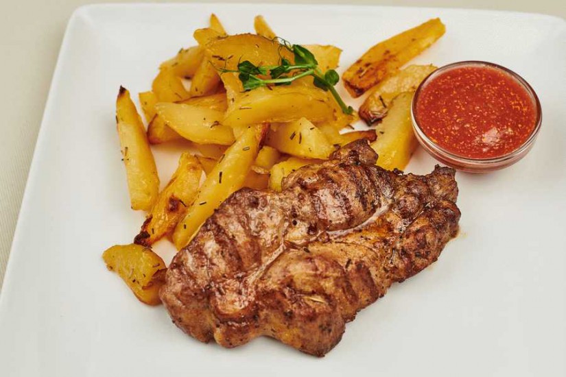 Стейк из куриного филе, Гренки с сыром и чесноком, Френч дог, Соус сливочно-сырный, Картофель фри классический
