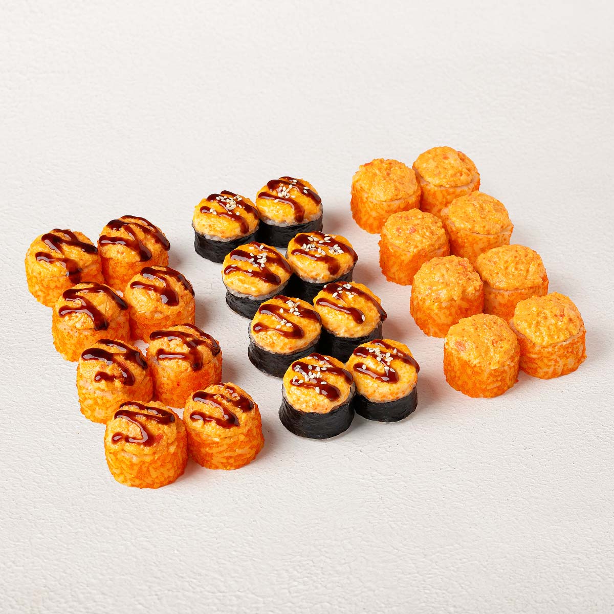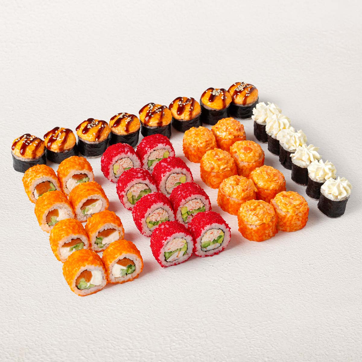 Ролл Филадельфия классик, Ролл Калифорния классик, Ролл Нагато с белым соусом, Ролл Сансей с белым соусом