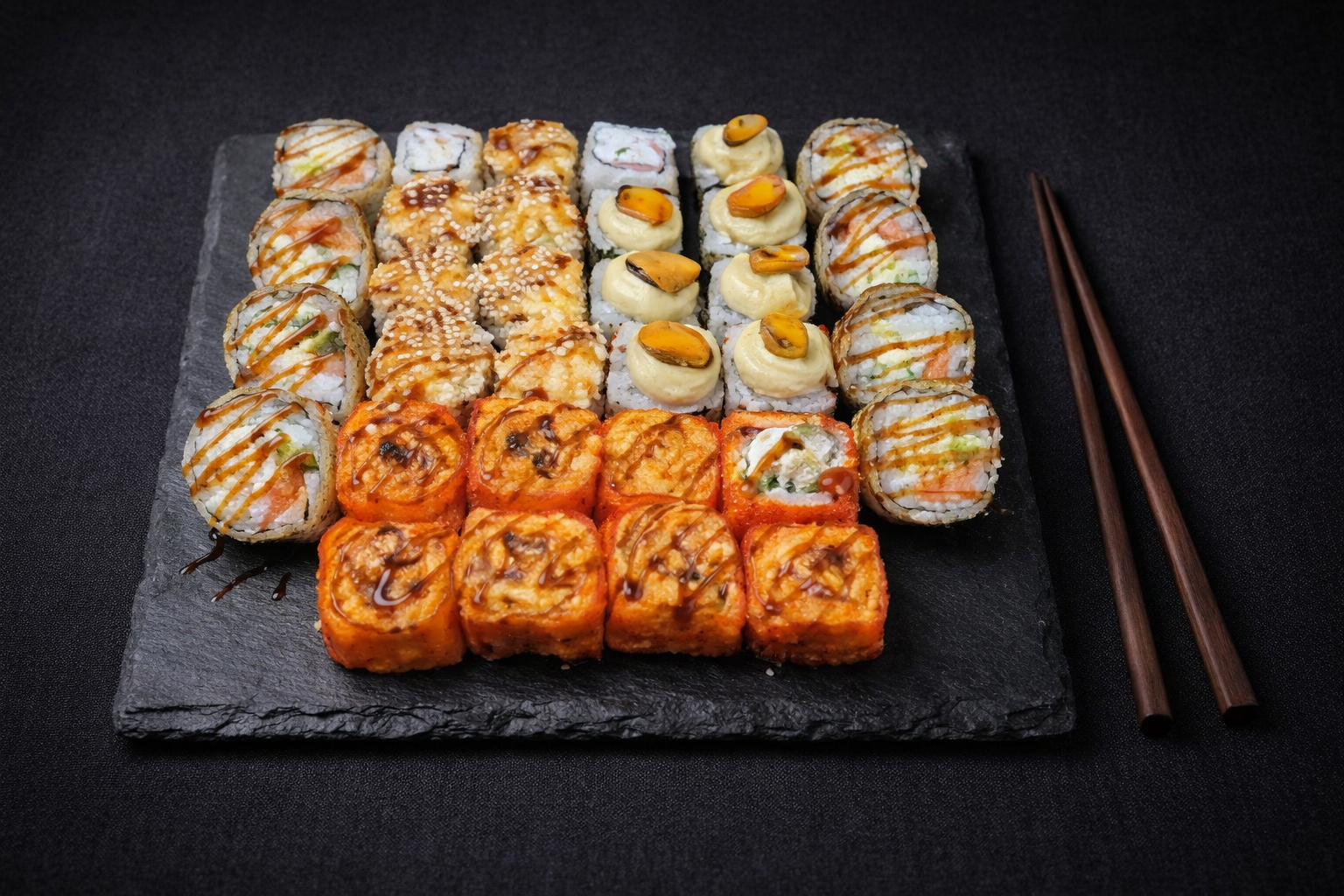 Хоккайдо, Дон-бекон, Филадельфия классика, Дуэт, Спайси соус, Васаби, Имбирь, Ореховый соус, Калифорния с креветкой