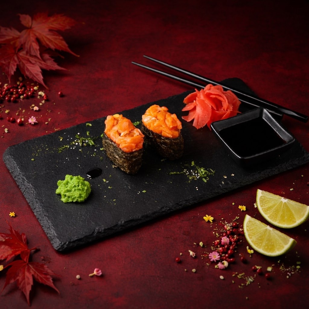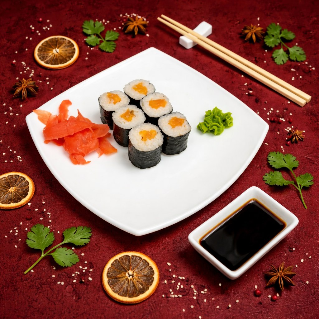 Студенческий. Соуса и приборы отдельно., 3 × Соевый соус, 2 × Имбирь, Калифорния в кунжуте