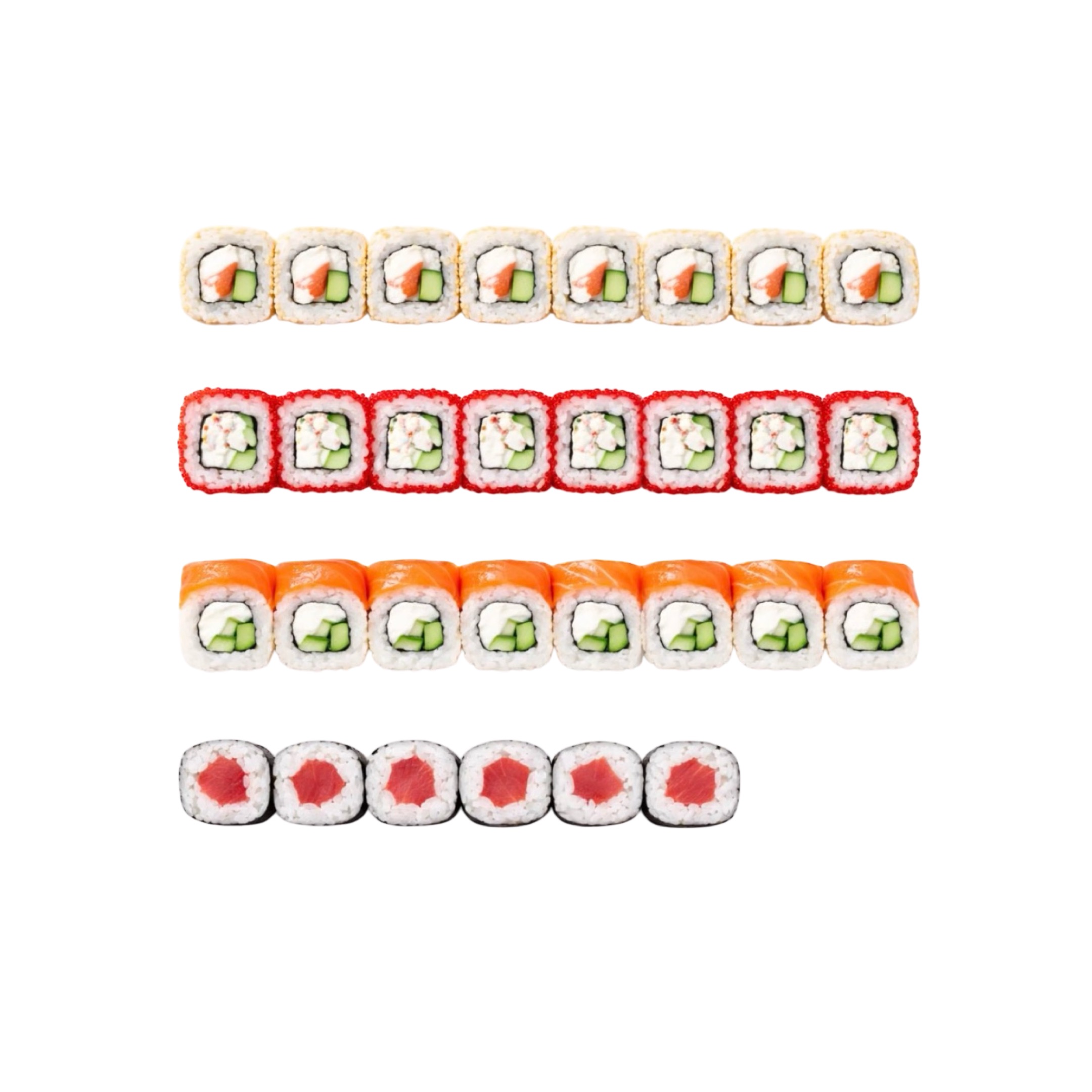Ролл Калифорния классик, Ролл Филадельфия классик, Стрипсы куриные, Ролл Калифорния с креветкой